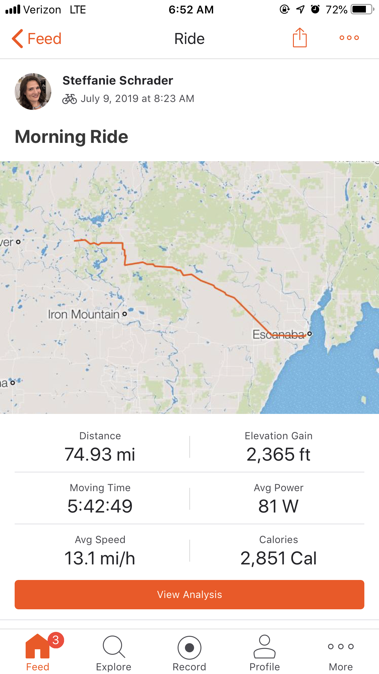 This seventy-five mile day was pretty long, but I felt great. The last push up to the school in Crystal Falls where we stayed was a large, long hill, and old me would have given up mentally. But, thanks to losing 40 pounds (so far), and greatly improving my muscle and cardiovascular strength has really been paying off, and I made it up that hill without even thinking of quitting. When I got to the top and rolled in to camp, I was on a high. All those miles and hills and I felt awesome!