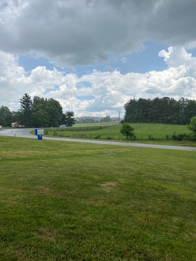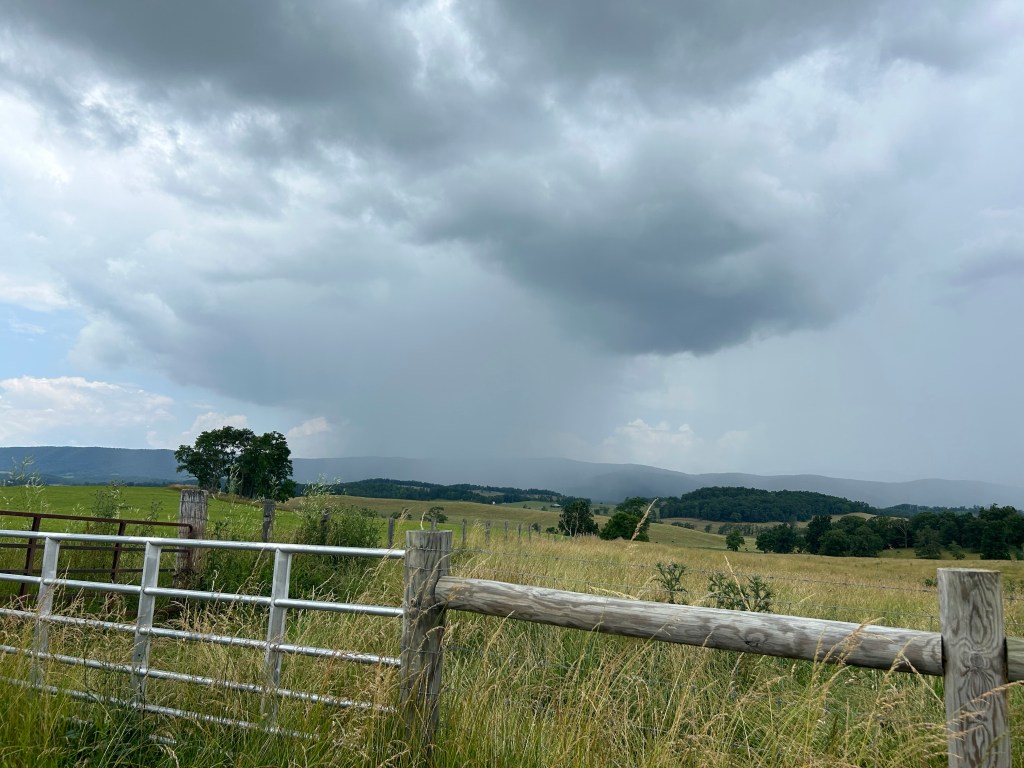 That stop worked out well, and not just because I got to see not one but two cats (from afar) and a whole herd of groundhogs. It ended up being the division between a morning of climbing and an afternoon of descending. The weather and the scenery remained much the same as we began heading back towards Staunton. Then the clouds became apparent.