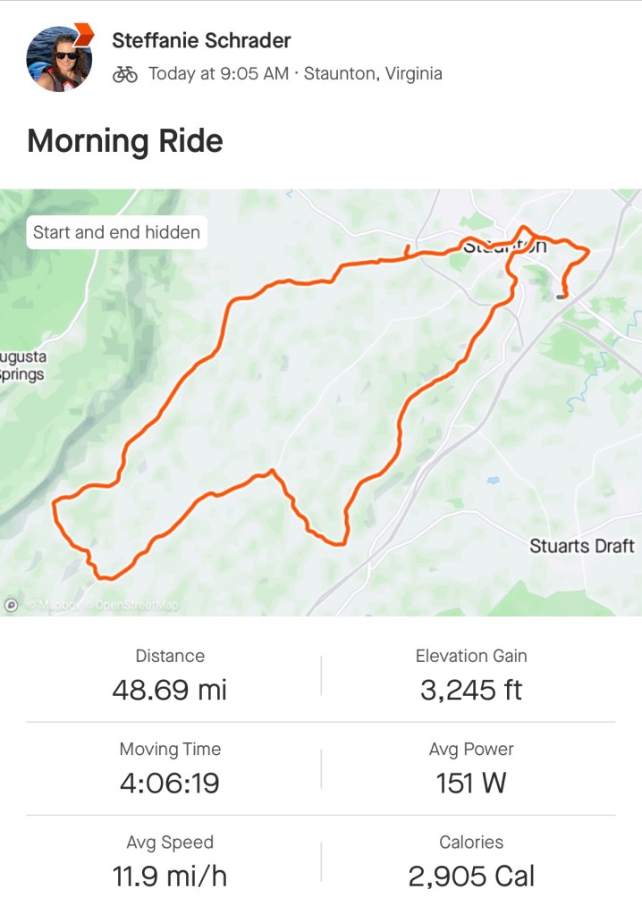 Today’s was a long, fairly challenging, but immensely satisfying ride, definitely my favorite so far. Tomorrow morning we’ll pack up, drive about a half hour over to Harrisonburg, and set up for the next three days. We’re looking at the 35 mile route as long as the timing and weather work. At this very moment the forecast doesn’t look stellar, but I don’t have a ton of faith in forecasts these days.