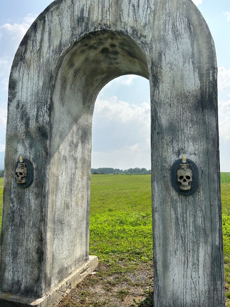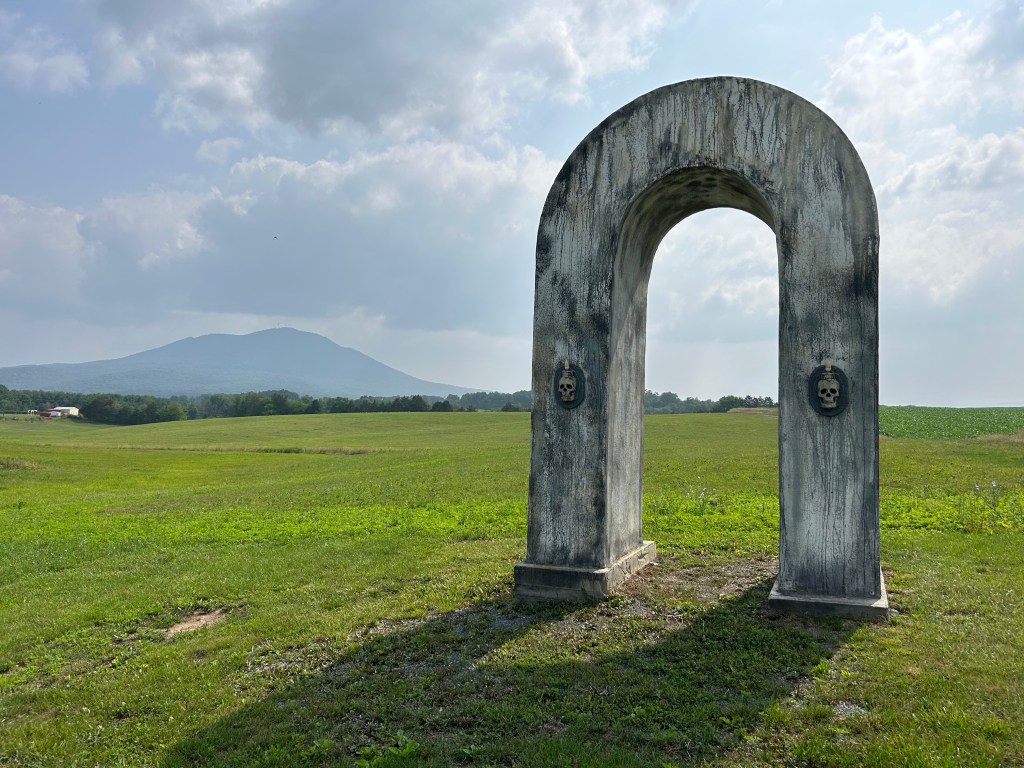 The sights were more of the same: farms, houses, the distant mountains, and winding two lane blacktop. Then we passed by this odd monument.
