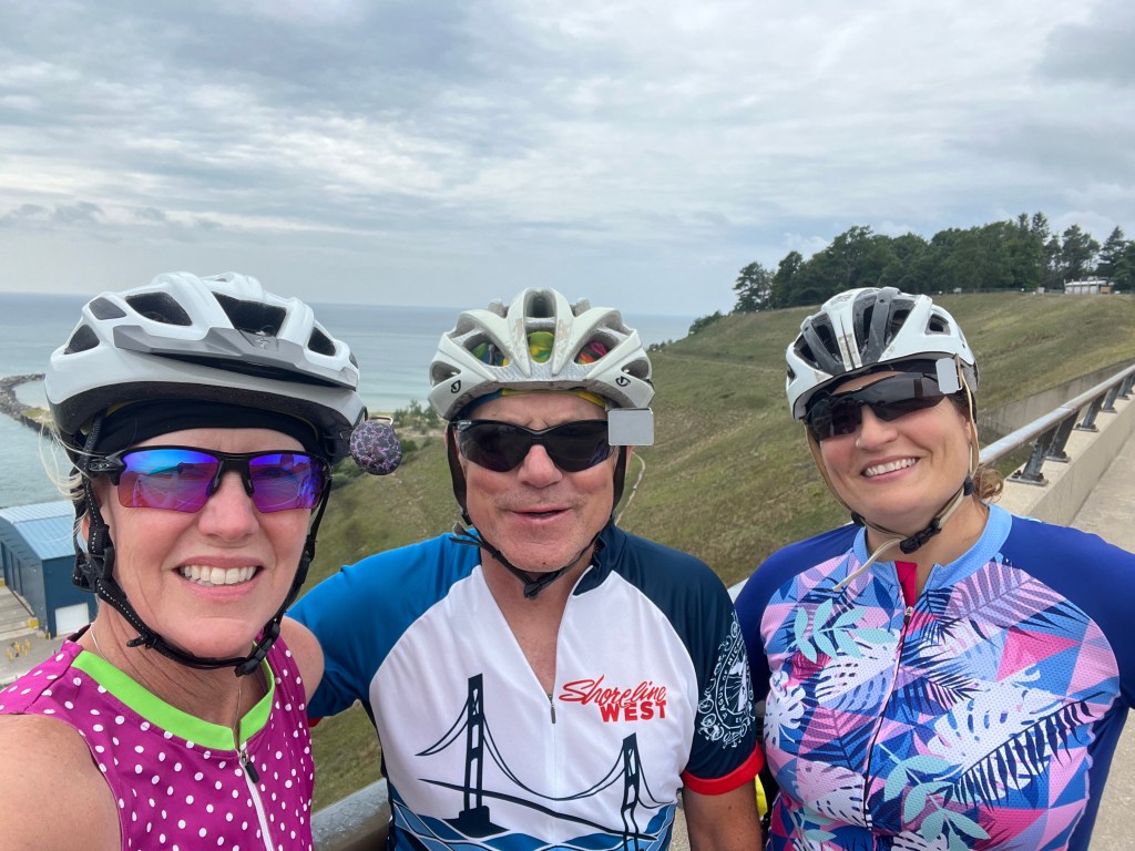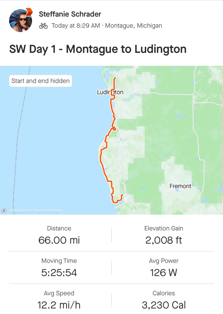 We finally got into Ludington around 6pm. The school we normally would stay at is under construction, so we’re several miles out of town at a wedding venue (a metal building with a somewhat rustic barn-like thing going on). A shower truck instead of a locker room is the biggest difference for me.