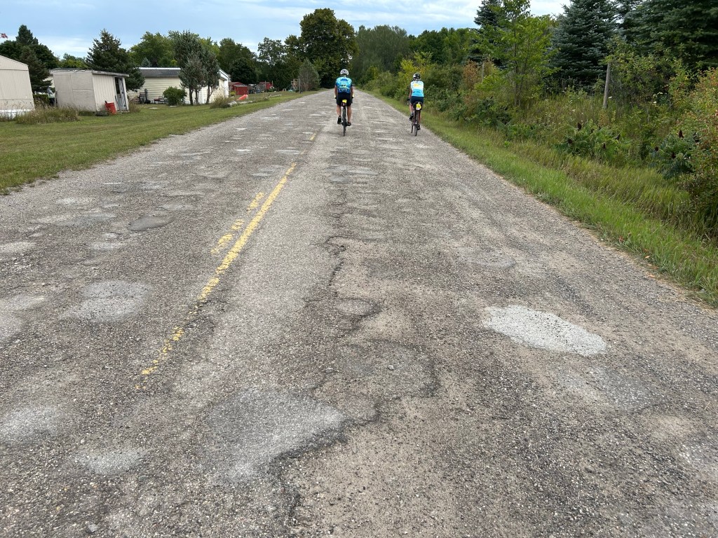 At Bayshore, we rode what I feel is the quintessential Michigan road. It was obviously a paved road at one point in its life, but calling it paved now is being far too generous. It’s as though somewhere along the line the local maintenance authority said to tell with it and never touched it again. Down the center I could still see the painted line in places, but the rest was chunks of asphalt, potholes, and gravel. It was time for my heavy, steel, wide-tired gravel bike to shine. My choice was vindicated! For a mile or two.