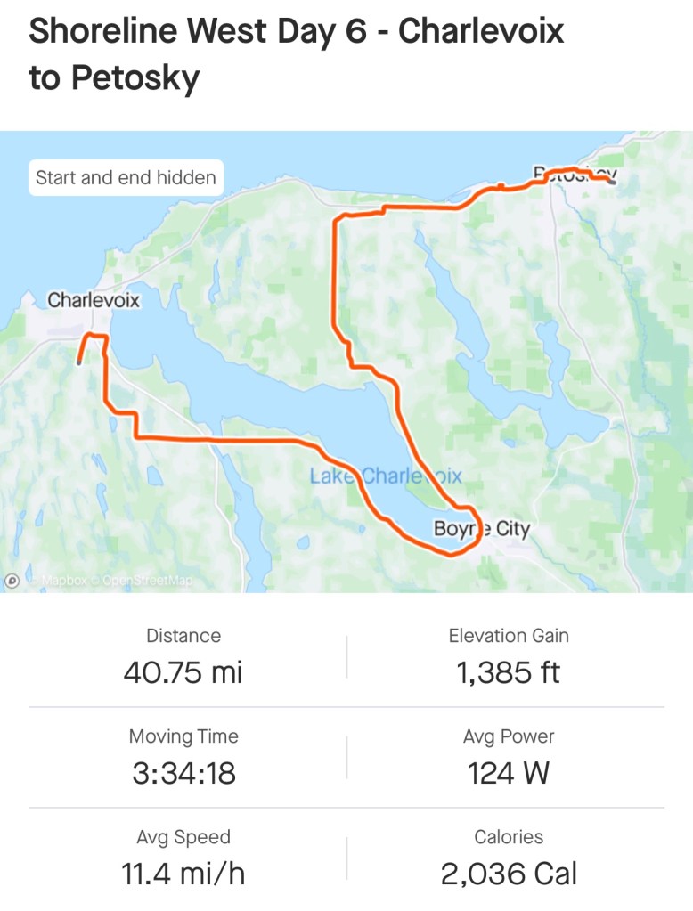 Today was another great day, except for about a half hour of it. This morning was cool and bright, and by the time I’d packed my gear I was warm enough to take off the sweatshirt. We rolled out at the standard 8:20, knowing we didn’t have much pressure as our route was only 39 miles. We chose the longer route that took us over to Boyne City before heading back west to Petosky.