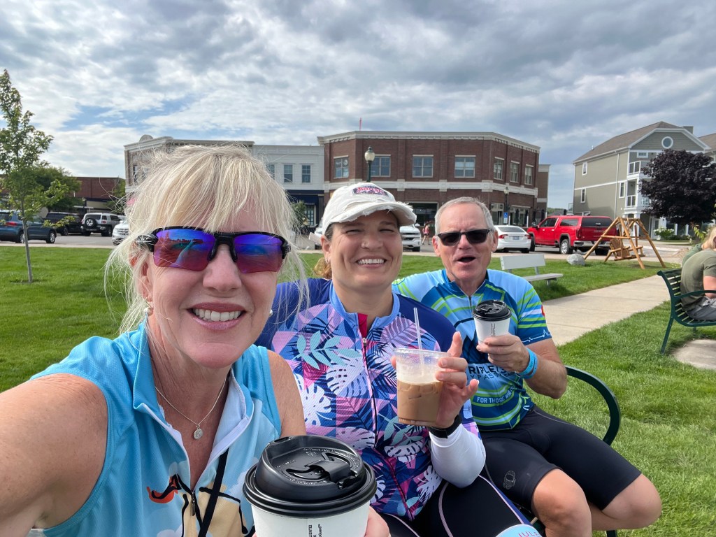 The roads were flat after the climb out of the ferry, and we reached Boyne City in good spirits with time to enjoy. So we found a cafe and got coffees to go, and took them to a bench overlooking the lake.