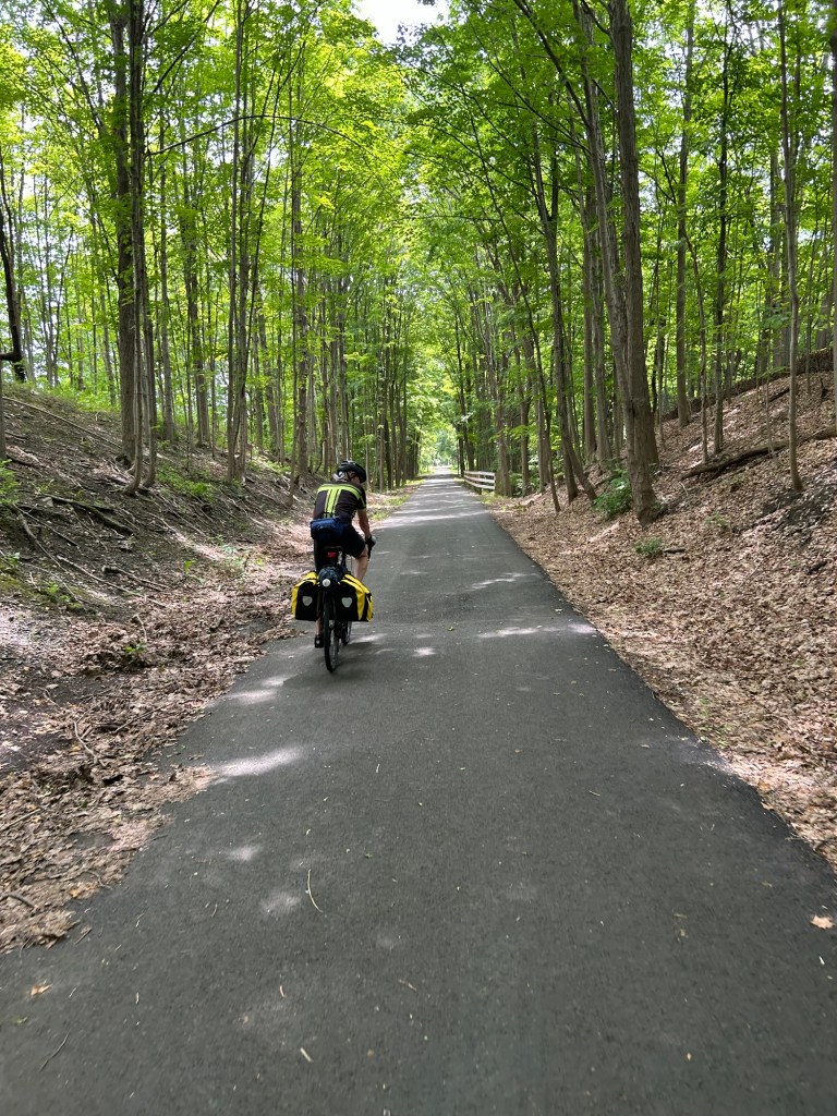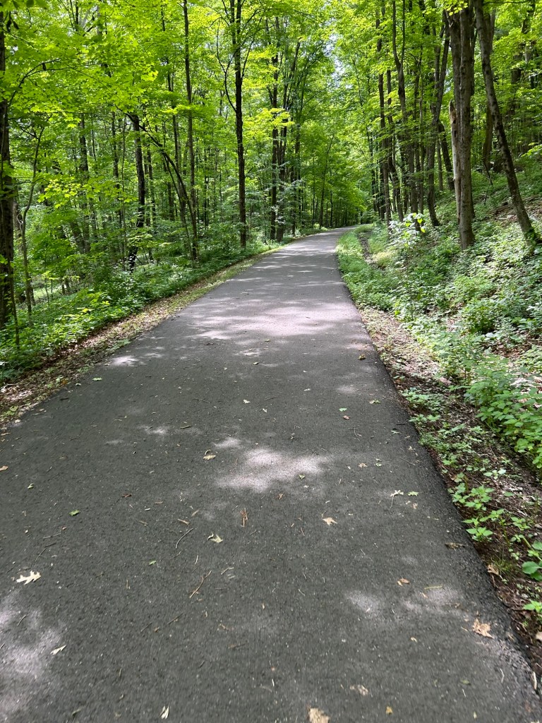 It was a lovely path, a wide asphalt ribbon running through a dense green forest. Although we had both put on jackets when we started off, we were ready to put them away after a few miles. The rest of the day was a very pleasant partly sunny, short sleeve kind of day.
