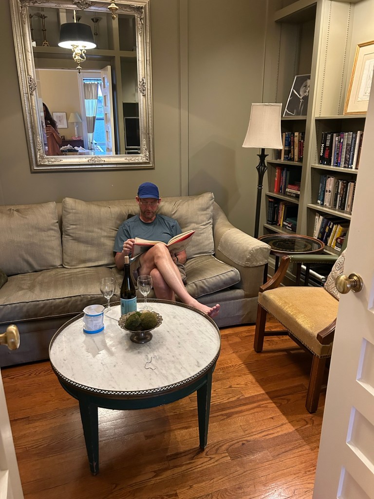 We had a couple of glasses of wine in the garden, then walked to Sukhothai for a wonderful Thai dinner. Then we came back with some ice cream, looked through some of the books in our library, and finished the wine.